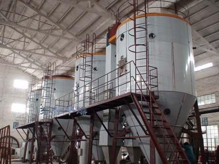 2. Tar éis scagadh agus téamh, tagann aer isteach sa dáileoir aeir atá ag barr an triomadóra, bíonn aer te ag spiaireacht go cothrom isteach sa seomra triomú. Déantar leacht ábhair trí atomizer lártheifeacha ardluais, atá ar bharr an choirp túir, (rothlach) a spraeáil isteach i coirnín leachtach ceo an-bhreá, teagmháil leis an aer te agus i dtréimhse an-ghearr ama a bheith tirim mar tháirgí críochnaithe. Aschuir táirgí críochnaithe go leanúnach ó bhun an túir thriomú agus ón deighilteoir cioclón, trí lucht leanúna sceite ag déanamh aerfholmhú.